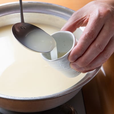 博多水炊きさもんじでは、「博多地どり」の鶏ガラを無塩・無添加で手間を惜しまず、じっくり煮込んでいます。